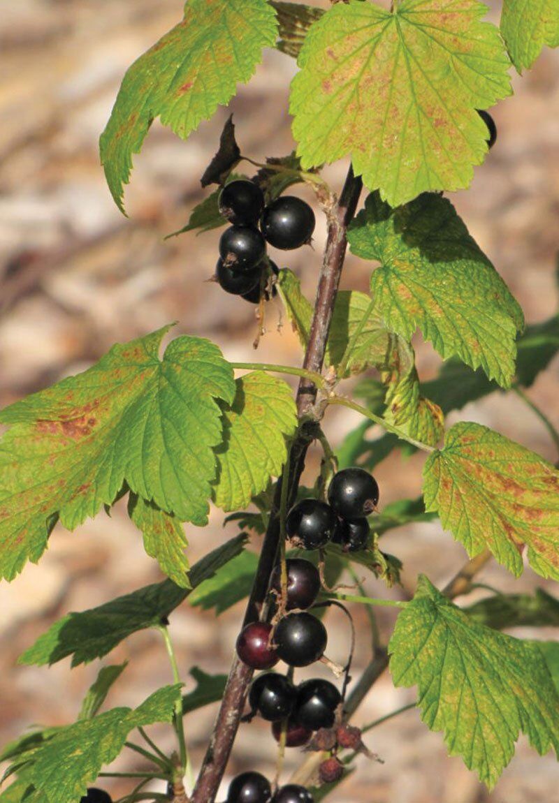 American black currant, Ribes americanum, "is a thornless, erect native shrub with showy yellow flowers in early spring followed by edible black berries in mid-summer. It is an excellent choice for moist, shady sites."