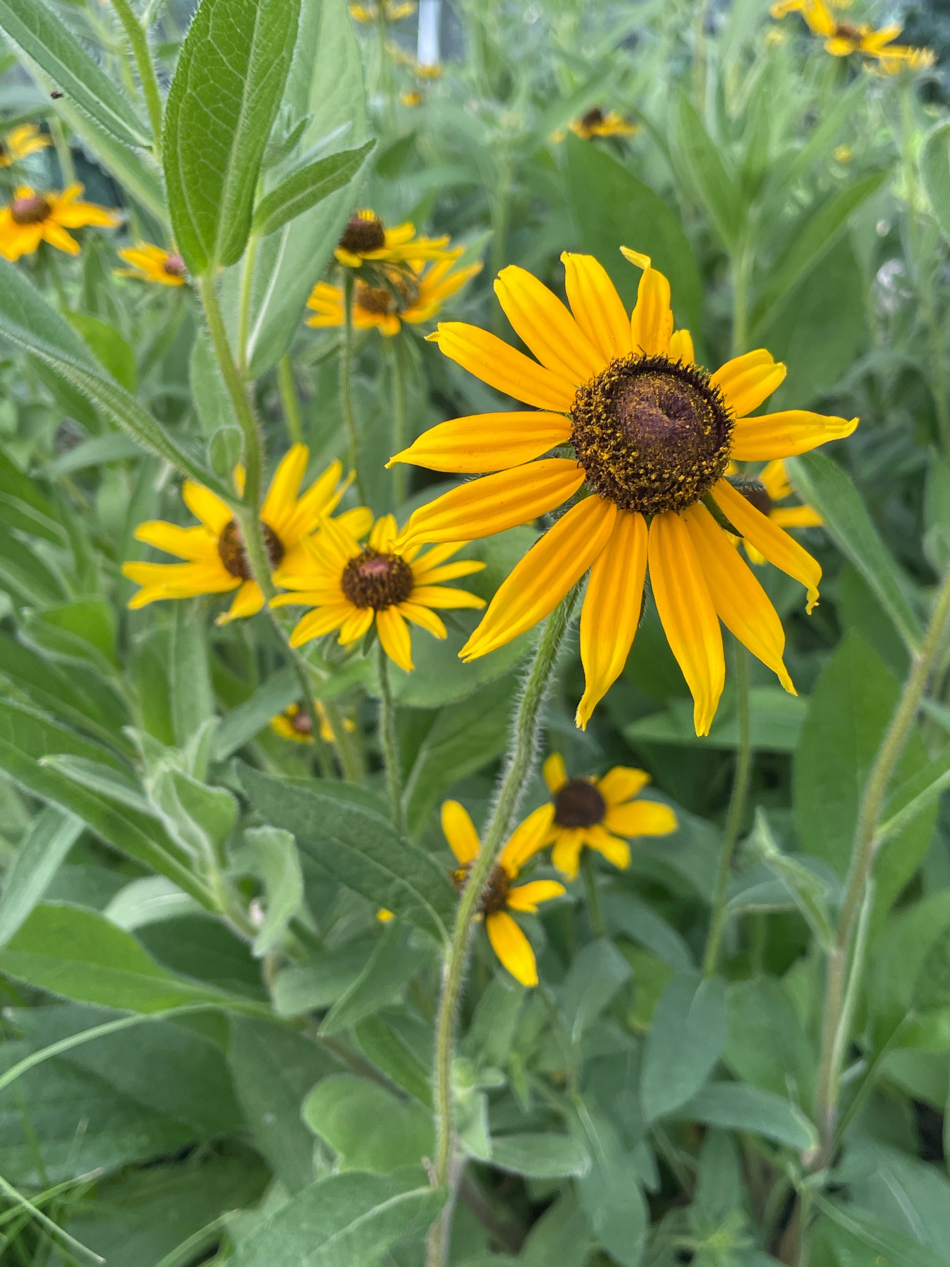 - Flowers: Bright yellow petals radiate from a dark brown or black central cone, blooming profusely from early summer to fall.