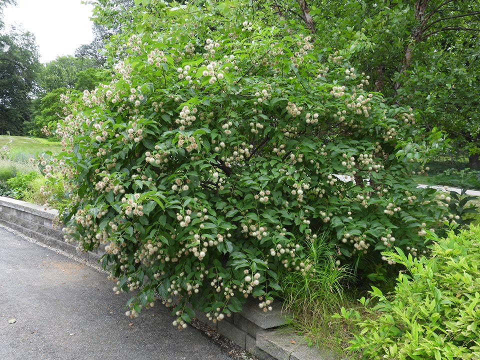 Buttonbush, Cephalanthus occidentalis, is a medium/large shrub (5' - 12' height) that enjoys sunny, wet locations. Unique, round flower heads attract butterflies. Great addition to a rain garden.